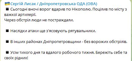 07.40 Ночью силы РФ ударили по Никополю в Днепропетровской области.