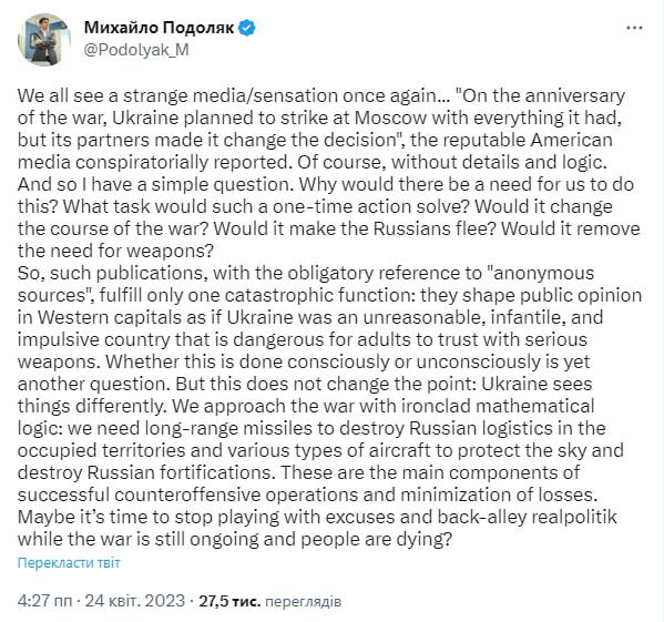 Сообщается, что глава ГУР Кирилл Буданов поручил одному из офицеров "подготовиться к массовым ударам 24 февраля всем, что есть в распоряжении ГУР", но в Белом доме высказали опасения, что такие атаки спровоцируют Путина на применение ядерного оружия.