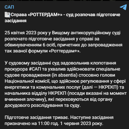 "25 апреля 2023 года в Высшем антикоррупционном суде начато подготовительное заседание по делу по обвинению 6 человек, причастных к введению так называемой формулы "Роттердам+". В судебном заседании суд удовлетворил ходатайство прокурора САП и принял решение осуществлять специальное судебное производство в отношении председателя Национальной комиссии, осуществляющей регулирование в сфере энергетики и коммунальных услуг (далее — НКРЭКУ) и начальника отдела НКРЭКУ (должности указаны на момент совершения преступления) , которые скрываются от досудебного расследования и суда", - говорится в сообщении.