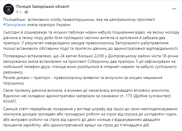 "Предварительно установлено, что 24 апреля около 22:00 в Днепровском районе города 18-летняя жительница сняла установленные на проспекте Соборном два флага. Ее действия сняли на мобильный телефон друзья, позже оно разошлось в интернет-сети и обрело общественный резонанс. Вещественные доказательства – флаги – правоохранители обнаружили и изъяли по месту жительства нарушительницы. Свою вину девушка признала, а совершенные действия пыталась оправдать влиянием алкоголя", - говорится в сообщении.