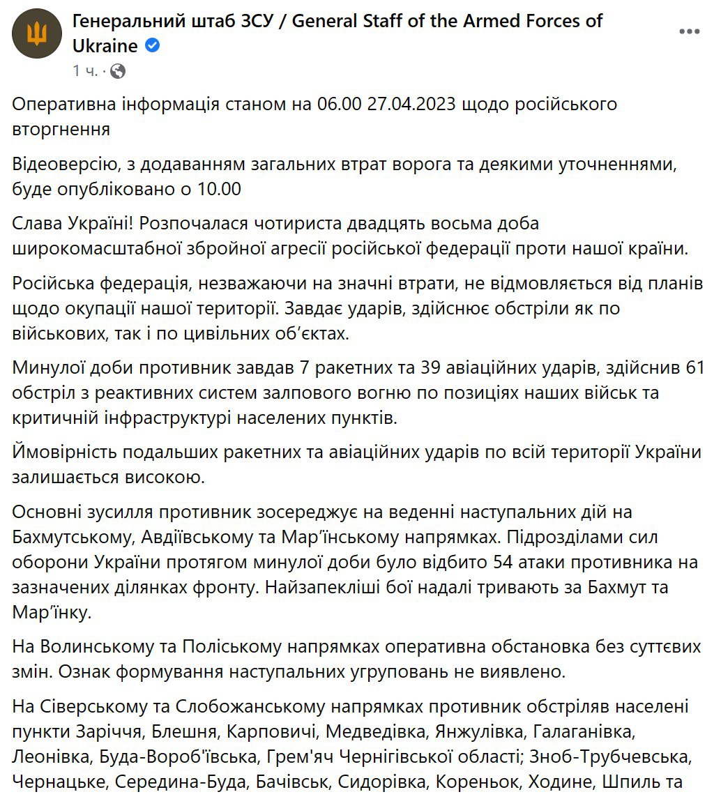 54 атаки за сутки. Тяжелые бои за Бахмут. Утренняя сводка Генштаба