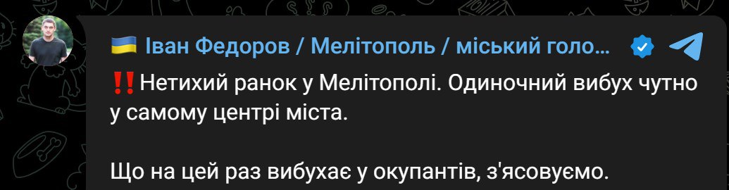 08.19 В центре Мелитополя раздался взрыв, сообщил мэр города Иван Федоров.