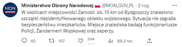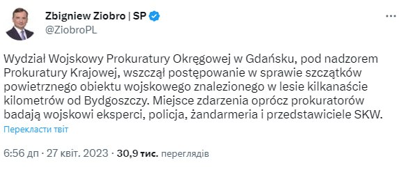 09.56 Министр юстиции Польши Збигнев Зебро сообщил об обнаруженных остатках воздушного военного объекта.