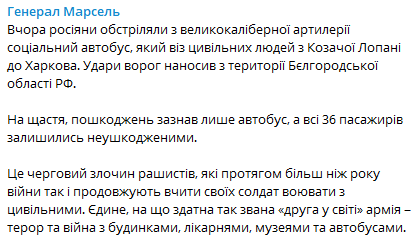 В Харьковской области российские войска вчера обстреляли социальный автобус, который вез гражданских людей из Казачьей Лопани в Харьков. Никто из 36 пассажиров не пострадал.