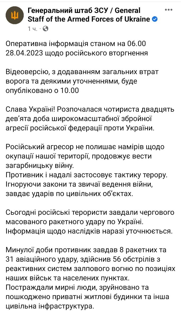 В пятницу, 28 апреля, в Украине идет уже 429-й день войны с Россией.