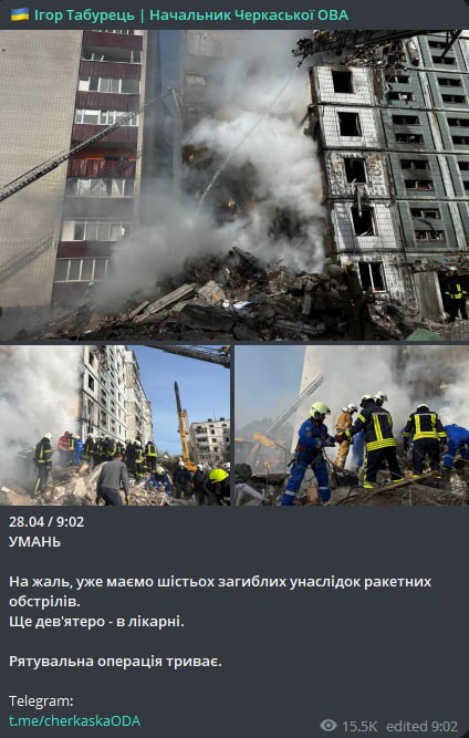 07.45 В результате удара по Умани погибло 3 человека, 8 ранены, сообщает глава Черкасской ОВА.