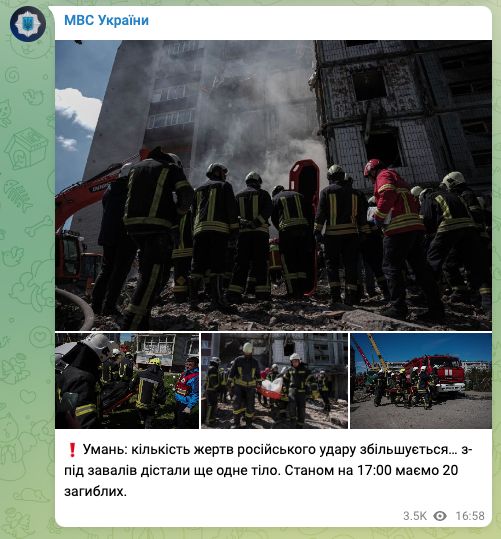 Число погибших в Умани Черкасской области в результате сегодняшнего ракетного удара возросло до 20 человек. Еще 18 — ранены, 9 из них находятся в больнице.