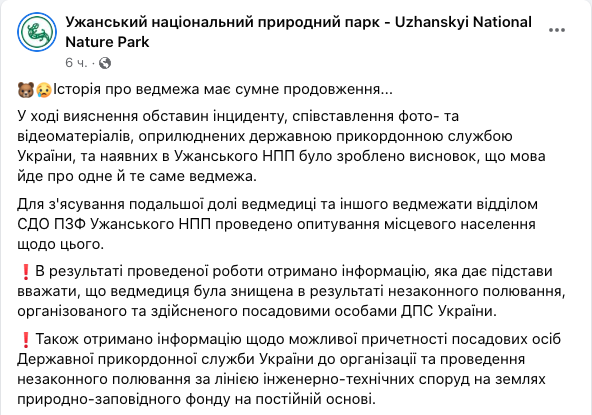 "В ходе выяснения обстоятельств инцидента, сопоставления фото- и видеоматериалов ... был сделан вывод, что речь идет об одном и том же медвежонке. В результате проведенной работы получена информация, которая дает основания считать, что медведица была уничтожена в результате незаконной охоты, организованной и осуществленной должностными лицами ГПС Украины", - говорится в заявлении нацпарка.