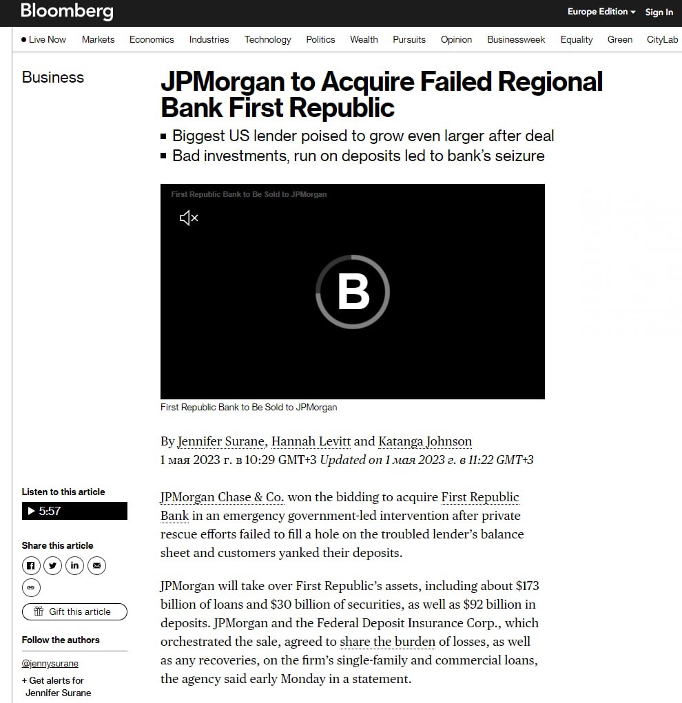 В США обанкротился третий крупный банк за последние два месяца - First Republic. Его поглощает JPMorgan Chase Bank.