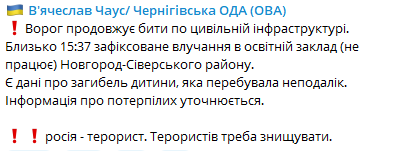 В Черниговской области в результате обстрела неработающего образовательного учреждения в Новгород-Северском районе погиб ребенок, который находился неподалеку.