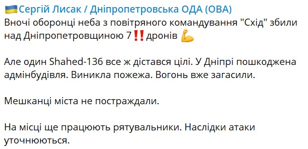 При этом защитники из воздушного командования "Восток" сбили над Днепропетровской областью семь дронов.