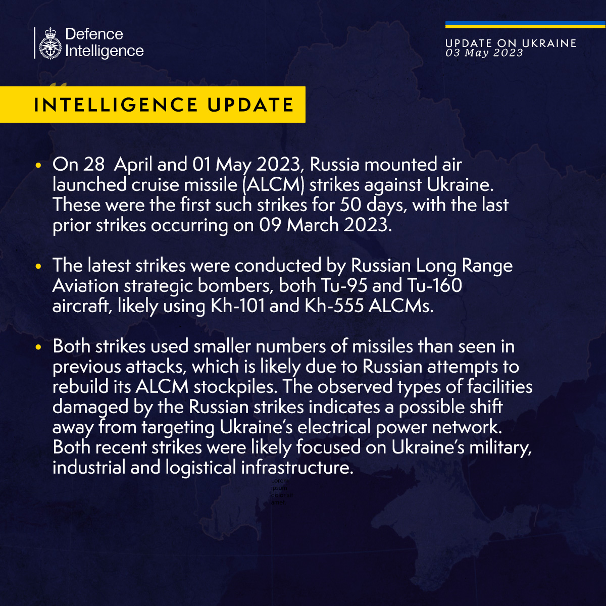 28 апреля и 1 мая россияне нанесли по Украине удары крылатыми ракетами воздушного базирования (КРВБ). Это первые атаки этим вооружением за 50 дней (после 9 марта).