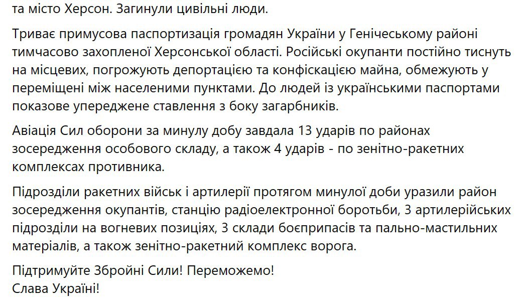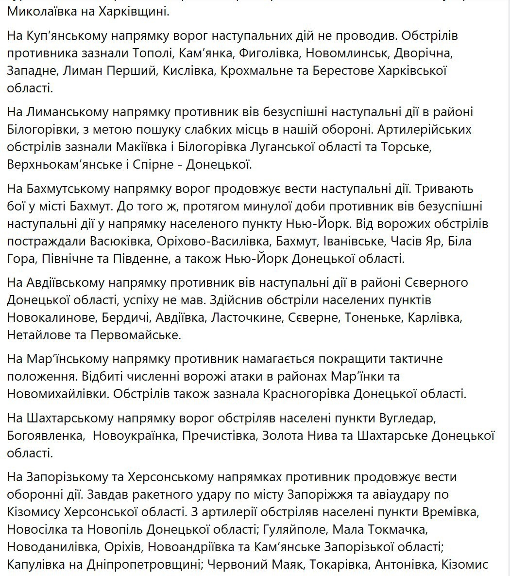 3. На Волынском, Полесском, Северском, Слободском, Купянском, Авдеевском, Шахтерском, Запорожском и Херсонском направлениях обстановка без существенных изменений.