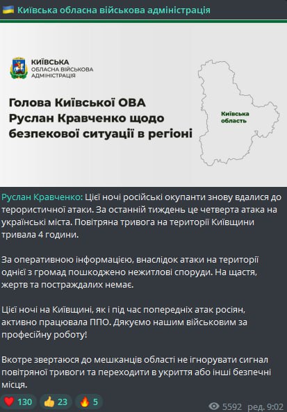 09.17 Ночью в Киевской области был прилет, повреждены нежилые помещения, обошлось без пострадавших, сообщает областная ВГА.