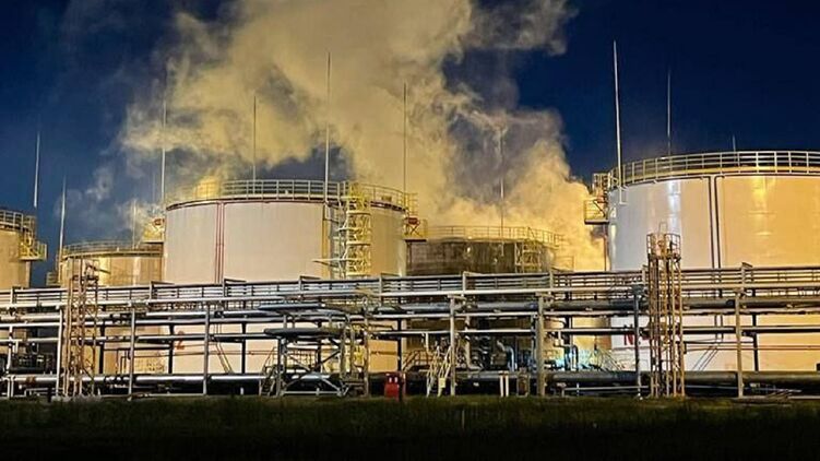 "РИА Новости" со ссылкой на экстренные службы сообщает, что причина пожара - удар беспилотника. В этот момент в резервуаре находилось 4,5 тысячи кубометров дизельного топлива.