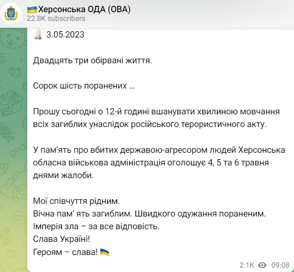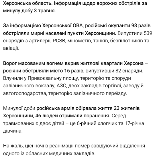 В Херсоне и области возросло количество погибших после вчерашних интенсивных обстрелов. По последним данным Херсонской ОВА, за сутки от обстрелов в области погибли 23 человека и 46 получили ранения.