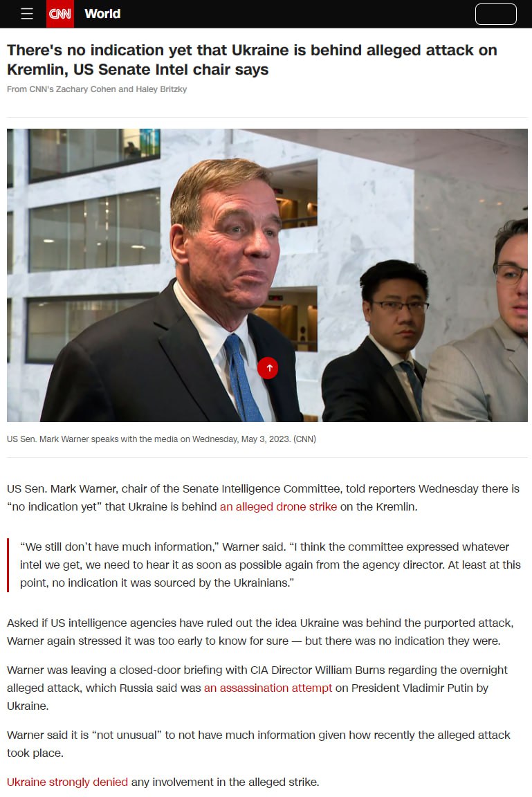 Председатель сенатского комитета по разведке сенатор США Марк Уорнер заявил, что "пока нет никаких признаков" того, что Украина стоит за предполагаемым ударом беспилотника по Кремлю.