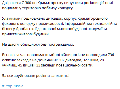 По данным Кириленко, всего за время полномасштабной войны россияне повредили 736 образовательных учреждений в Донецкой области: 302 детсада, 327 школ, 29 училищ, 45 вузов и 33 заведения внешкольного образования.