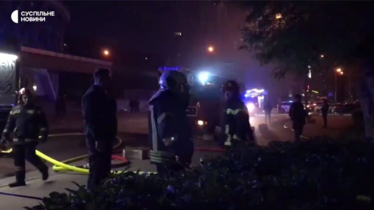 Взрывной волной разбиты стекла ТЦ. Появилось видео работы спасателей на месте падения беспилотника в Киеве