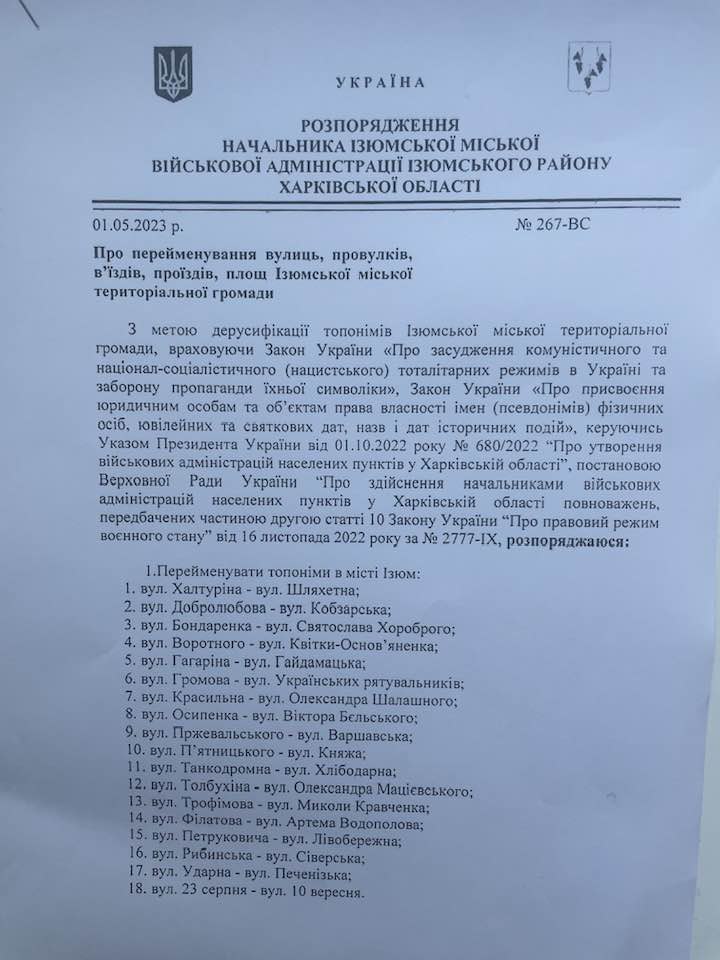 В Изюме Харьковской области завершили переименование улиц и площадей города.