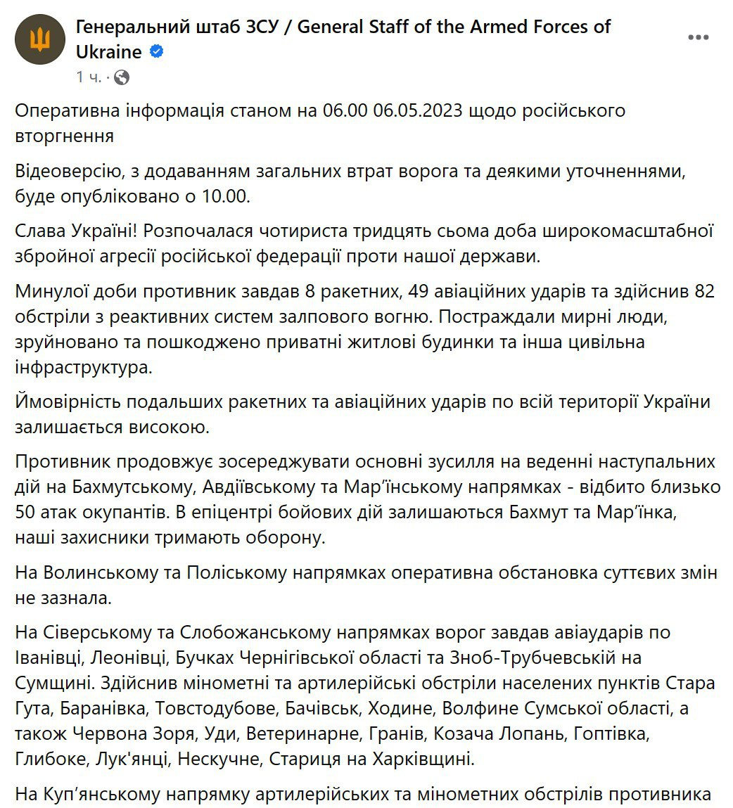 В субботу, 6 мая, Генштаб Вооруженных сил Украины опубликовал утреннюю сводку с фронта.