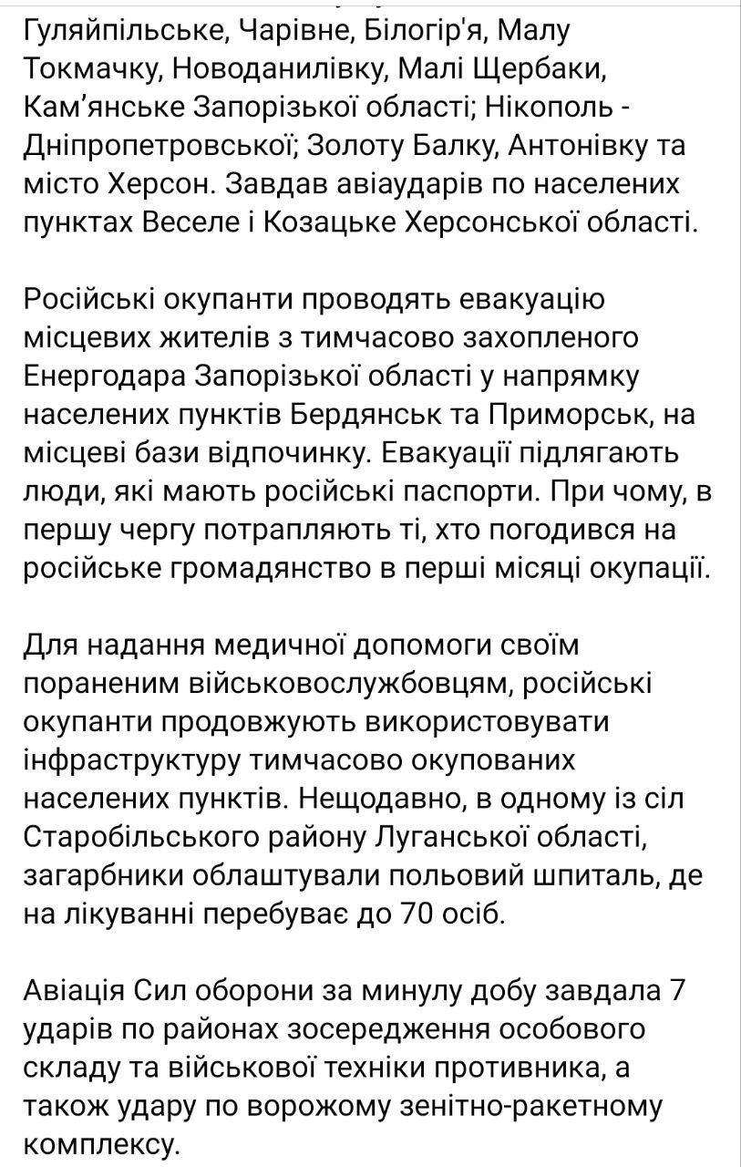 • По данным Генштаба, россияне эвакуируют жителей Энергодара на побережье Азовского моря под Бердянск.