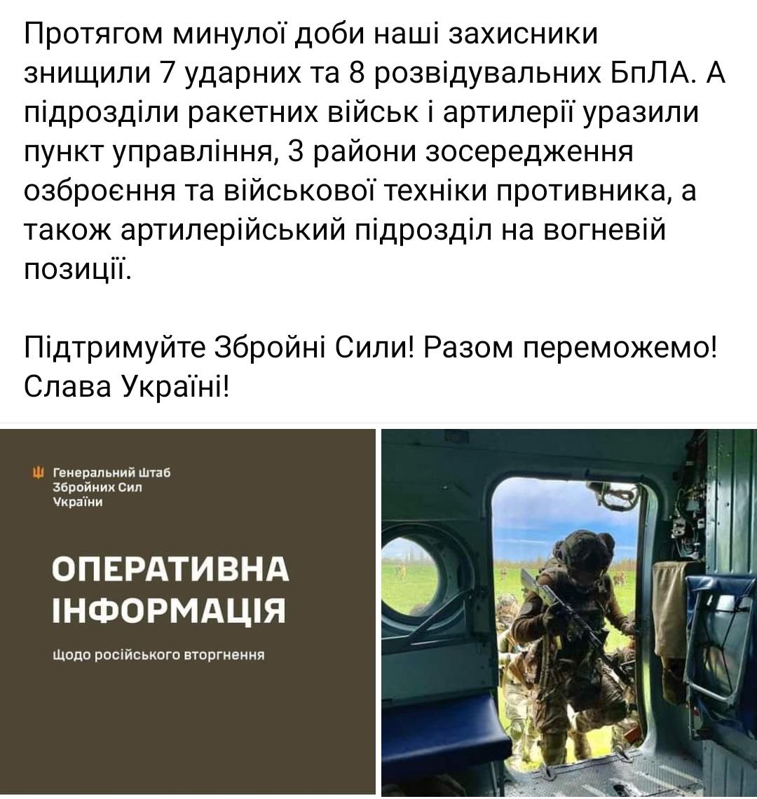 ВСУ за минувшие сутки 6 мая отбили более около 50 наземных атак россиян, сбили семь ударных и восемь разведывательных дронов.