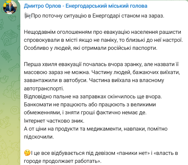 Мэр Энергодара Дмитрий Орлов сообщает подробности российской "эвакуации" жителей оккупированного Энергодара - города, где находится Запорожская АЭС.