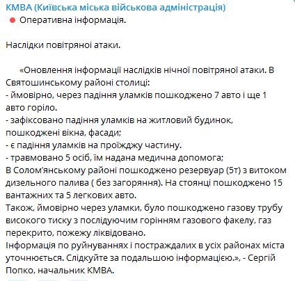 В Соломенском районе поврежден резервуар (5т) с утечкой дизельного топлива (без возгорания). На стоянке повреждено 15 грузовых и 5 легковых автомобилей.