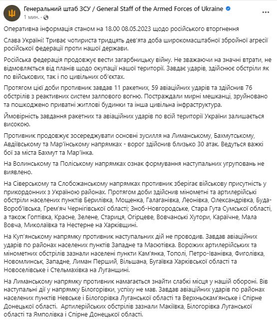 3. Противник сосредоточил основные усилия на Лиманском, Бахмутском, Авдеевском и Марьинском направлениях. Продолжаются тяжелые бои за города Бахмут и Марьинка. За прошедшие сутки было отражено 55 атак на этих участках фронта.