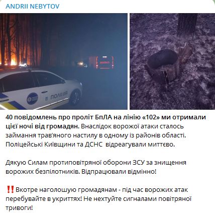 По данным главы Нацполиции Киевской области Андрея Небытова, ночью на линию "102" от украинцев поступило 40 сообщений о пролете беспилотников.