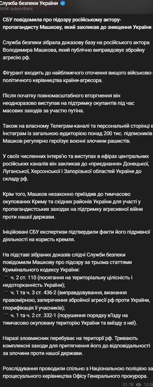 "После начала полномасштабного вторжения он неоднократно выступал в поддержку окупантов во время массовых мероприятий с участием Путина. Также на собственном Телеграмм-канале и персональной странице Инстаграм с общей аудиторией более 200 тыс. подписчиков Машков регулярно героизирует военные преступления рашистов", - говорится в сообщении.