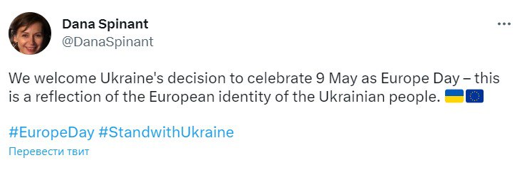 "Мы приветствуем решение Украины отмечать 9 мая День Европы - это отражение европейской идентичности украинского народа", - подчеркнула она.