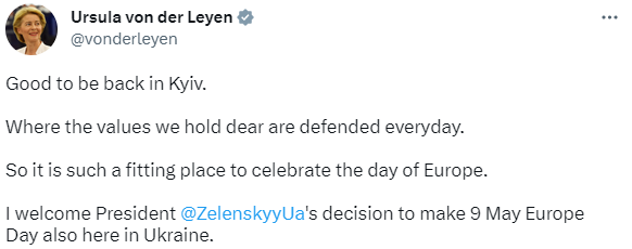 "Хорошо снова оказаться в Киеве. Где ценности, которыми мы дорожим, защищаются каждый день. Так что это такое подходящее место для празднования дня Европы. Я приветствую решение Президента Зеленского сделать 9 мая Днем Европы и здесь, в Украине", - написала она.