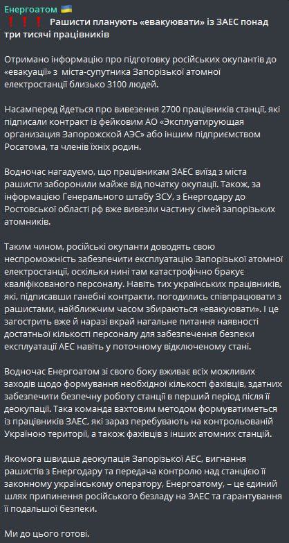 При этом советник гендиректора "Росэнергоатома" Ренат Карчаа ранее заявлял, что эвакуации персонала атомной станции не планируется.