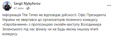 Он сказал, что информация, представленная The Times, не соответствует действительности. Офис президента Украины не обращался к организаторам "Евровидения" с предложением о проведении онлайн-выступления Владимира Зеленского ни во время финала, ни на любом другом этапе конкурса.