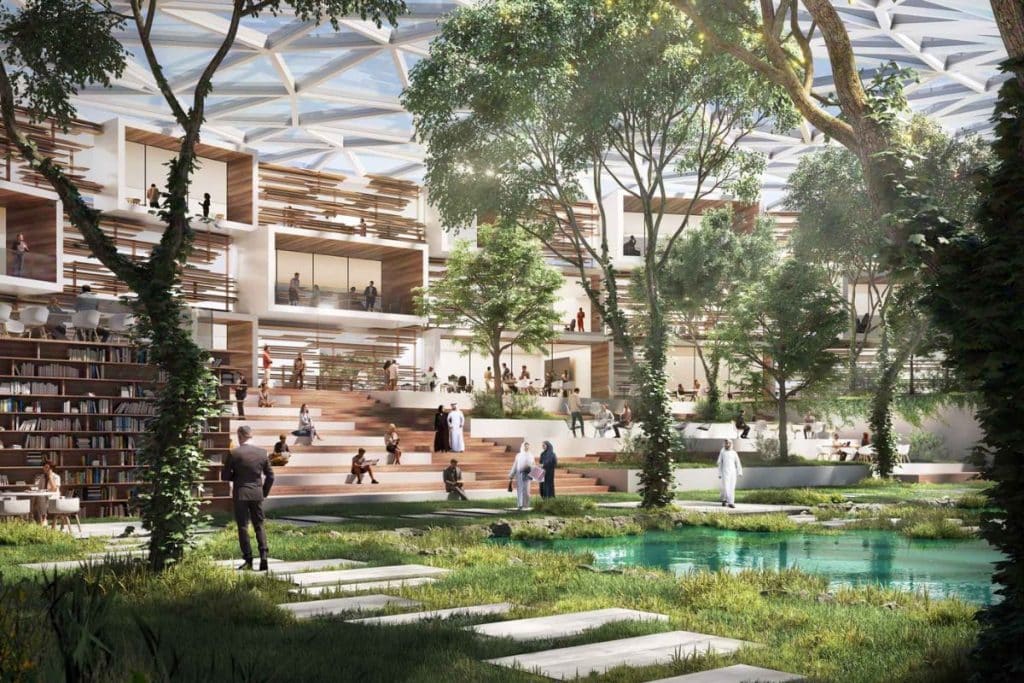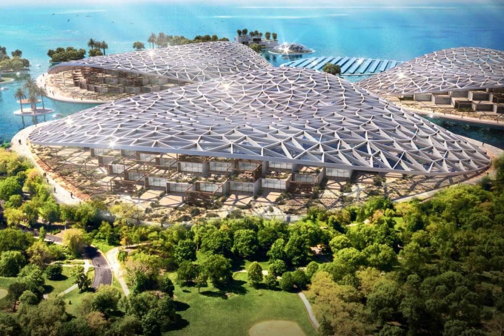 Искусственный риф, покрывающий 200 квадратных километров и являющийся домом для более чем одного миллиарда кораллов и 100 миллионов мангровых деревьев, также будет местом морского экотуризма с плавучими эко-домиками, работающими на 100% возобновляемых источниках энергии.