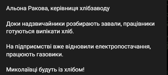 "Уважаемые партнеры, дорогие потребители, к сожалению, вы сегодня из СМИ услышали про то трагическое событие, которое произошла на предприятии. Но все люди живы и на предприятии, надеемся, с организованной работой и поддержкой областной военной администрации, работниками мэрии, "Облэнерго" и "Облгаза" у нас будет свет, газоснабжение и мы будем поставлять в дальнейшем хлебобулочные изделия по всем торговым точкам. Всю информацию в дальнейшем мы будем сообщать в более оперативной форме, заказывайте на завтра хлеб", - заявила руководитель хлебозавода Алена Ракова.
