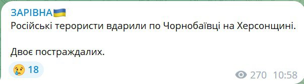 Также советник Андрея Ермака Дарья Заривная сообщила об ударе по Чернобаевке Херсонской области: здесь пострадало двое.