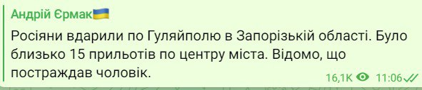 В субботу, 13 мая, российская армия обстреляла Гуляйполе Запорожской области. В результате ударов ранен мужчина.