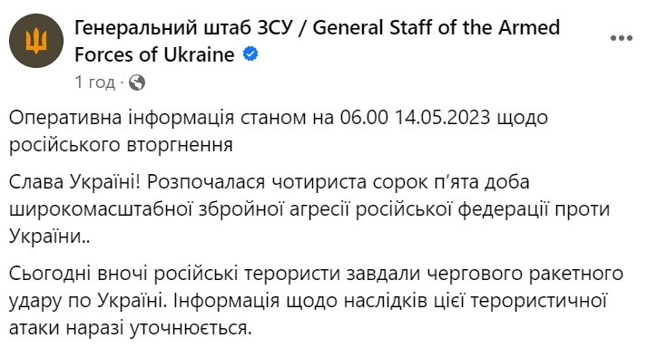 В ночь с 13 на 14 мая по Украине наносился очередной ракетный удар. Генштаб упоминает об этом в своей утренней сводке, но без деталей.