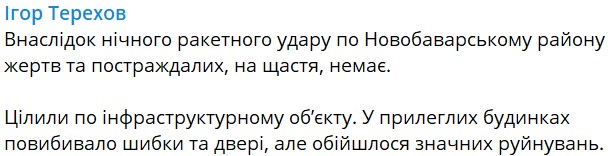 Глава Харьковской ОВА Олег Синегубов добавил, что в Харькове после вчерашнего обстрела поврежден объект транспортной инфраструктуры.