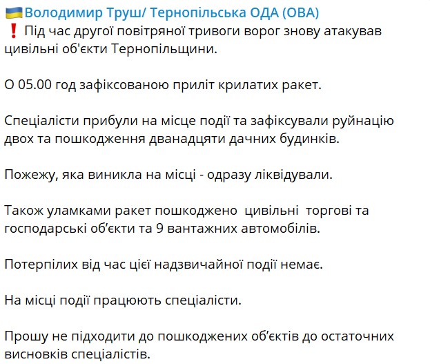 Около пяти часов утра мэр Тернополя призвал не снимать прилетов и заявил, что "на место падения обломков выехали специальные службы".