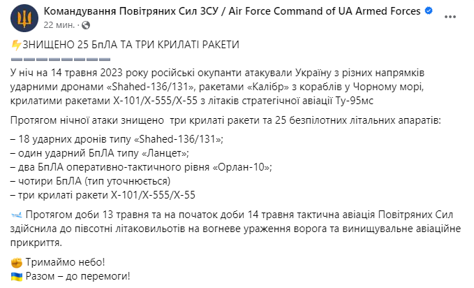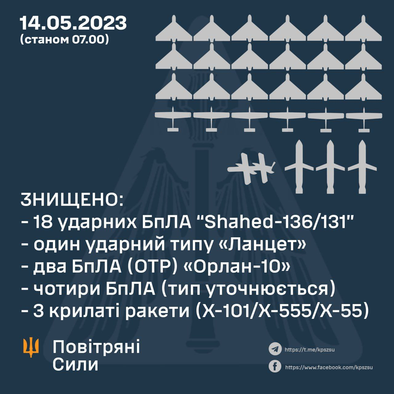 В Командовании Воздушных сил ВСУ сообщили детали очередной атаки на Украину, которая произошла в ночь на 14 мая.