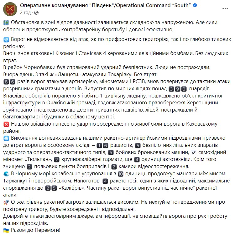 Об этом Оперативное командование "Юг" сообщило на своей странице в Фейсбуке.
