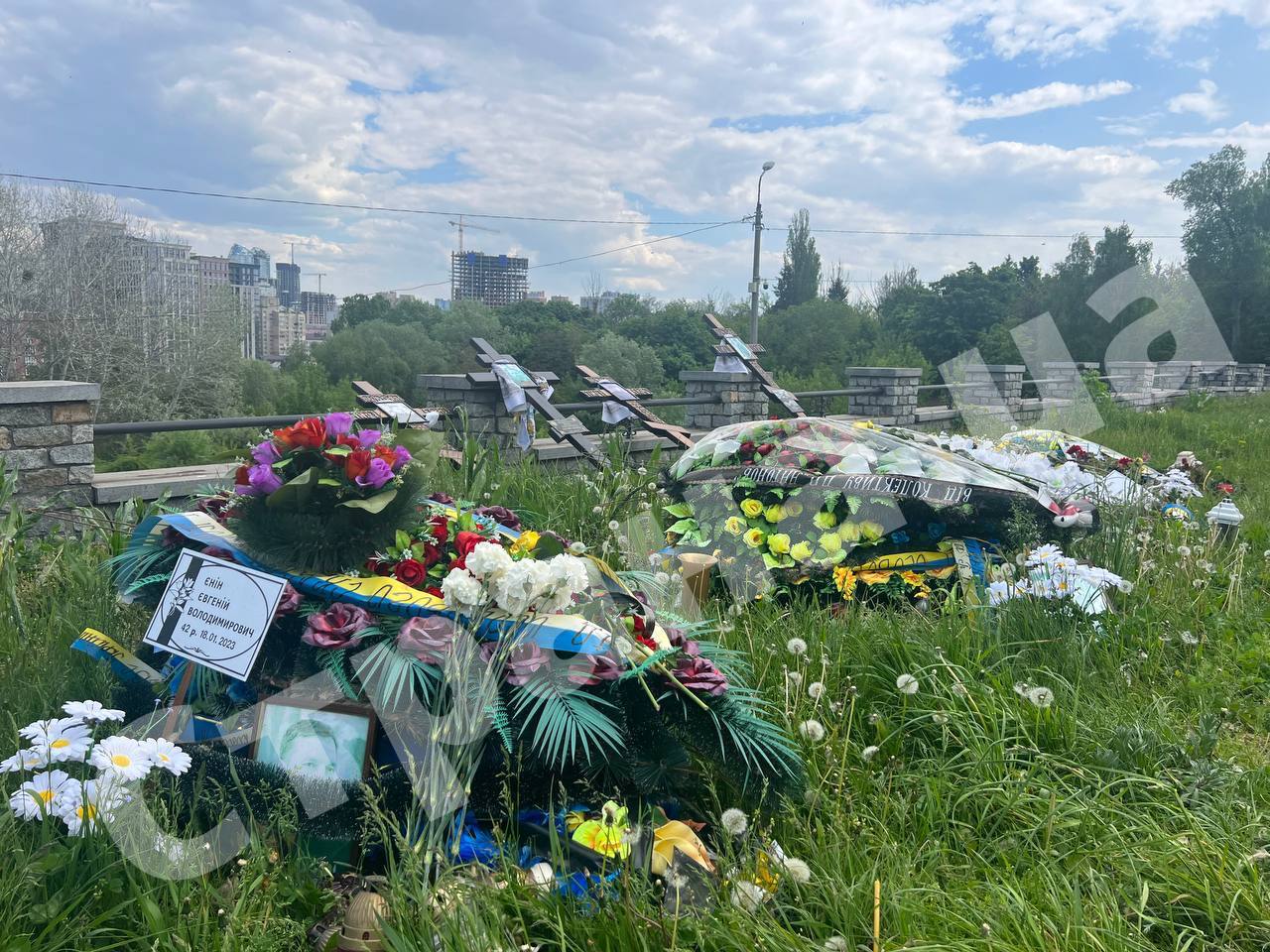 Судя по фото- и видеокадрам, сделанным корреспондентом, деревянные кресты и похоронные венки отложили в сторону от могил и уже проводят строительные работы по подготовке фундамента для захоронения.
