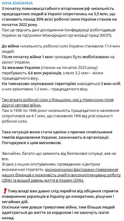 По данным исследования Конфедерации работодателей Украины при поддержке Международной организации труда (МОТ), с начала полномасштабного вторжения России численность трудоспособного населения в Украине сократилась на 5,5 миллионов человек, что составляет более 30% от общего числа рабочей силы Украины на начало 2022 года.
