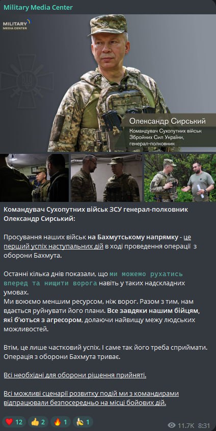 Командующий Сухопутными войсками ВСУ Александр Сырский заявил, что "мы сражаемся меньшим ресурсом, чем враг", тем не менее, продвижение войск на Бахмутском направлении - "первый успех наступательных действий" в ходе операции по обороне города.