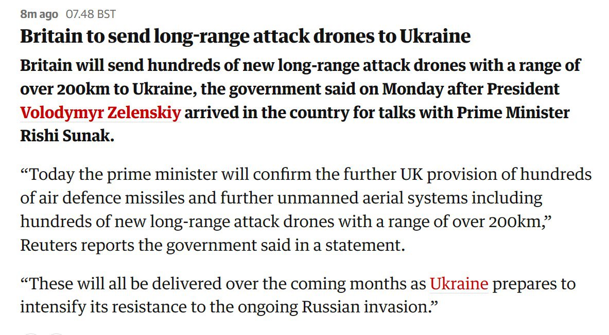 Британия отправит Украине 200 ударных беспилотников с радиусом действия более 200 километров - The Guardian