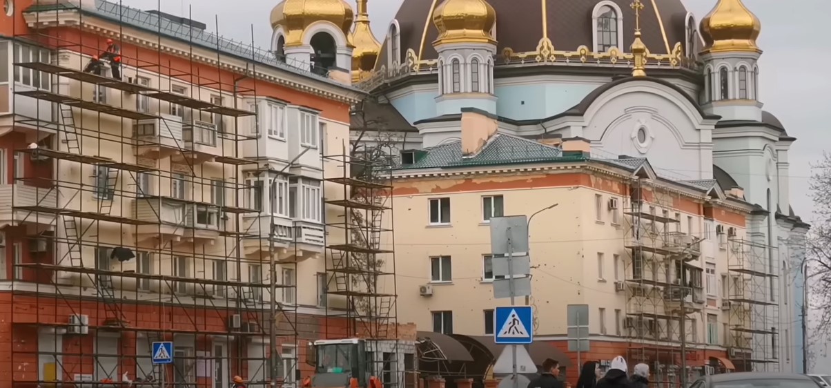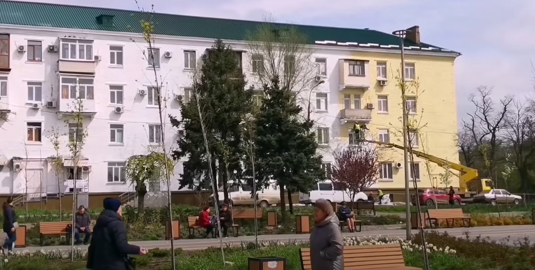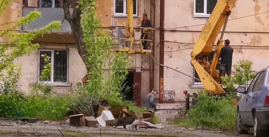 То, что все же отстраивают россияне, громко рекламируется. Новый квартал, который во время поездки посещал Путин, называется ЖК Невский (тоже отсылка к Петербургу). На его фасаде нарисовали девушку в цветах триколора.